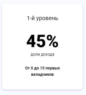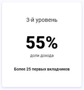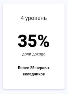Четвертый уровень имеет следующие условия: комиссия по ставкам до 35% и более 25 первых вкладчиков.