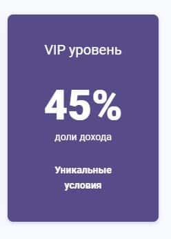 И последний уровень - это VIP, здесь условия такие: до 45% доли дохода и уникальные условия для игроков.