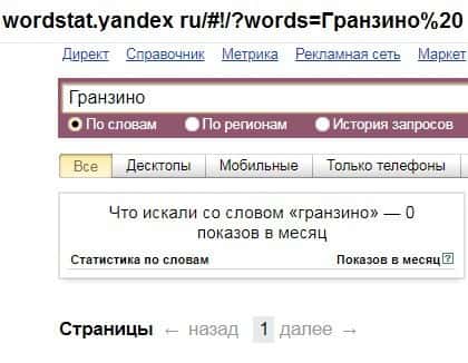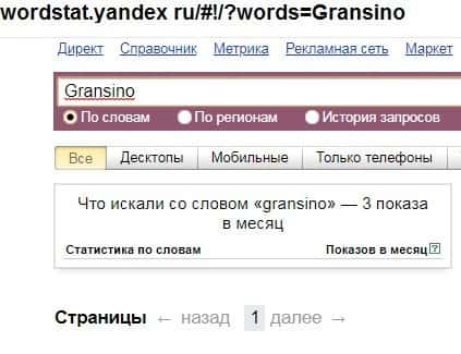 Рассмотрим второй запрос в поисковик Яндек: название бренда на русском языке "Гранзино " - результат 0 показов. Так вообще никто не искал шарагу в сети!