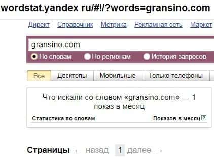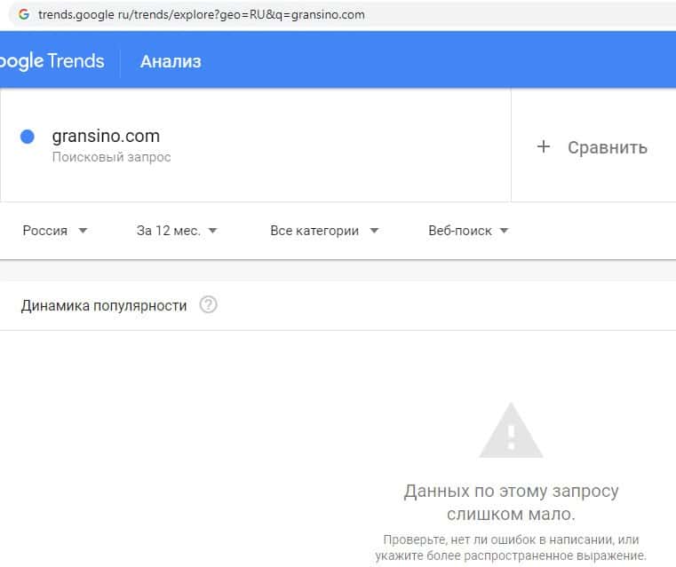 Онлайн-шарага Гранзино имеет почти нулевую популярность. По запросу: название домена конторы "gransino.com"- результат всего 1 показ в месяц.