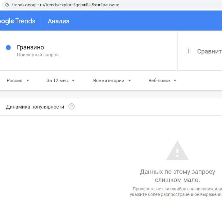 Последний вариант запроса в поисковик Google будет название бренда на русском языке "Гранзино" - результат остался прежним - 0 показов. Контору Гранзино в Google никто не искал!