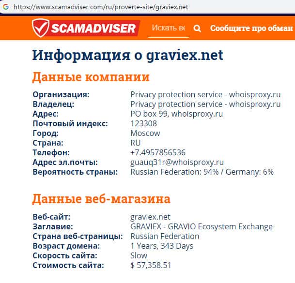 В связи с мошеннической и противозаконной деятельностью аферистов GRAVIEX их реальные руководители предпочитают анонимность дабы избежать ответственности со стороны правоохранительных органов. Техническую же информацию о мошенниках Гравикс можно узнать с помощью портала scamadviser com, которую вы можете прочесть ниже.