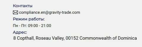 Далее представлены контактные данные мошеннической конторы Gravity Trade, где определенно указана электронная почта, а также адрес и место регистрации шараги: