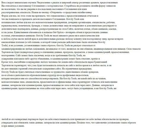 В соглашении конторы Гравити Трейд указывается информация, что мошенники предлагают своим клиентам использовать ее сайт на свой страх и риск, поэтому они не дают гарантий.