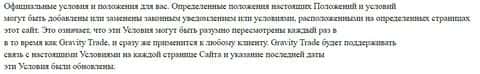 В официальных условиях лохотронской конторы Gravity Trade также указывается, что данный документ может быть изменен и дополнен в любой момент без предупреждения клиентов.