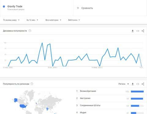 Бренд конторы "Гравити Трейд" в Гугл не искались ни разу, поэтому данный лохотрон можно считать не популярным в интернете вообще.