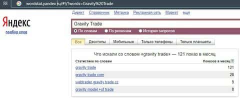 По поводу поиска сайта лохотрона по бренду его сайта "gravity-trade.com", то значения показов в поисковой системе Яндекс есть но слабые.