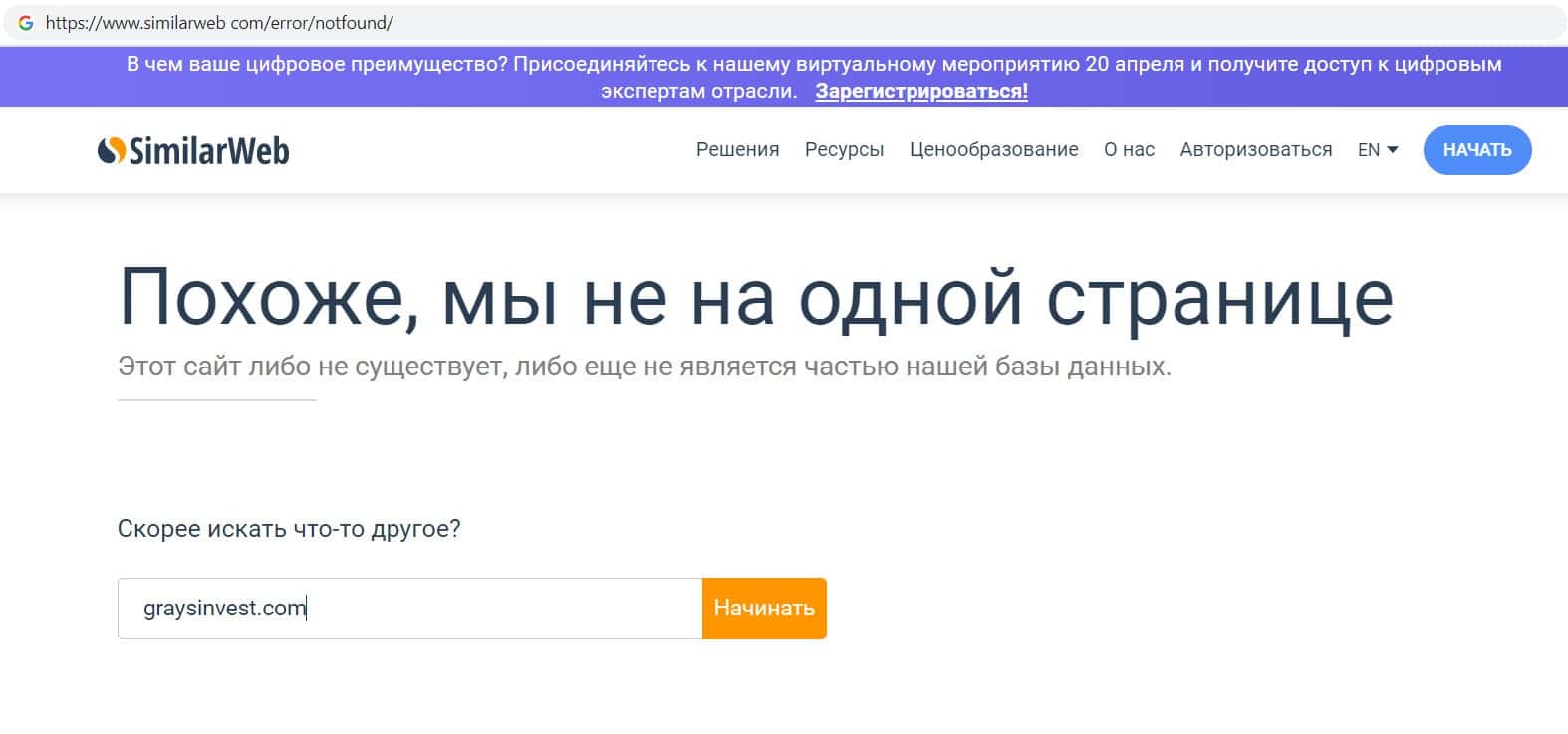 Для того, чтобы узнать трафик сайта GraysInvest мы использовали интернет - ресурс similarweb com. Оказалось, что международный сервис не знает о существовании этой фирмы.