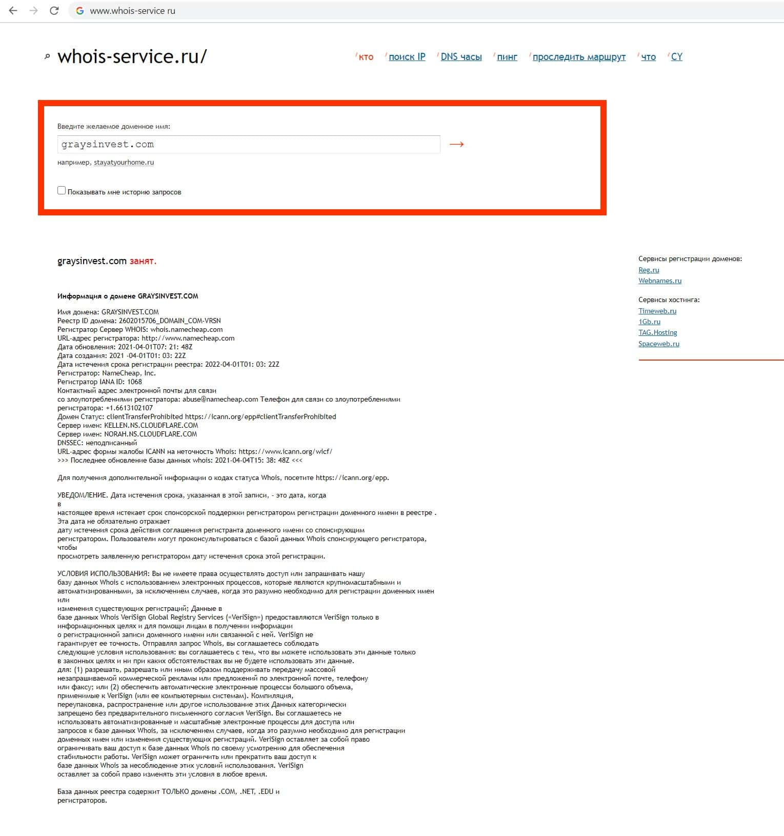 Кому принадлежит доменный адрес фирмы кидал GraysInvest?