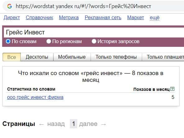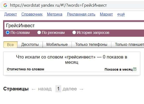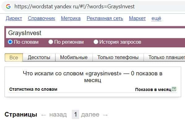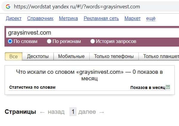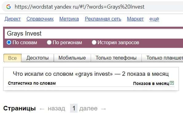 Мы проверили количество запросов конторы Грейс Инвест в Яндексе по названию фирмы, а именно "GraysInvest". Оказалось, что в течении месяца никто не выполнял данный запрос.