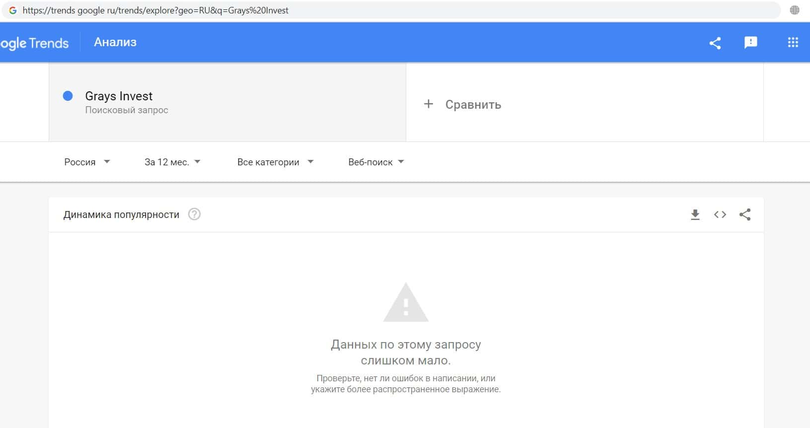 Проверили мы и количество запросов лохотрона GraysInvest по названию компании, но с пробелом, а именно "Grays Invest", но и этот запрос пользователи не выполняли целый год.