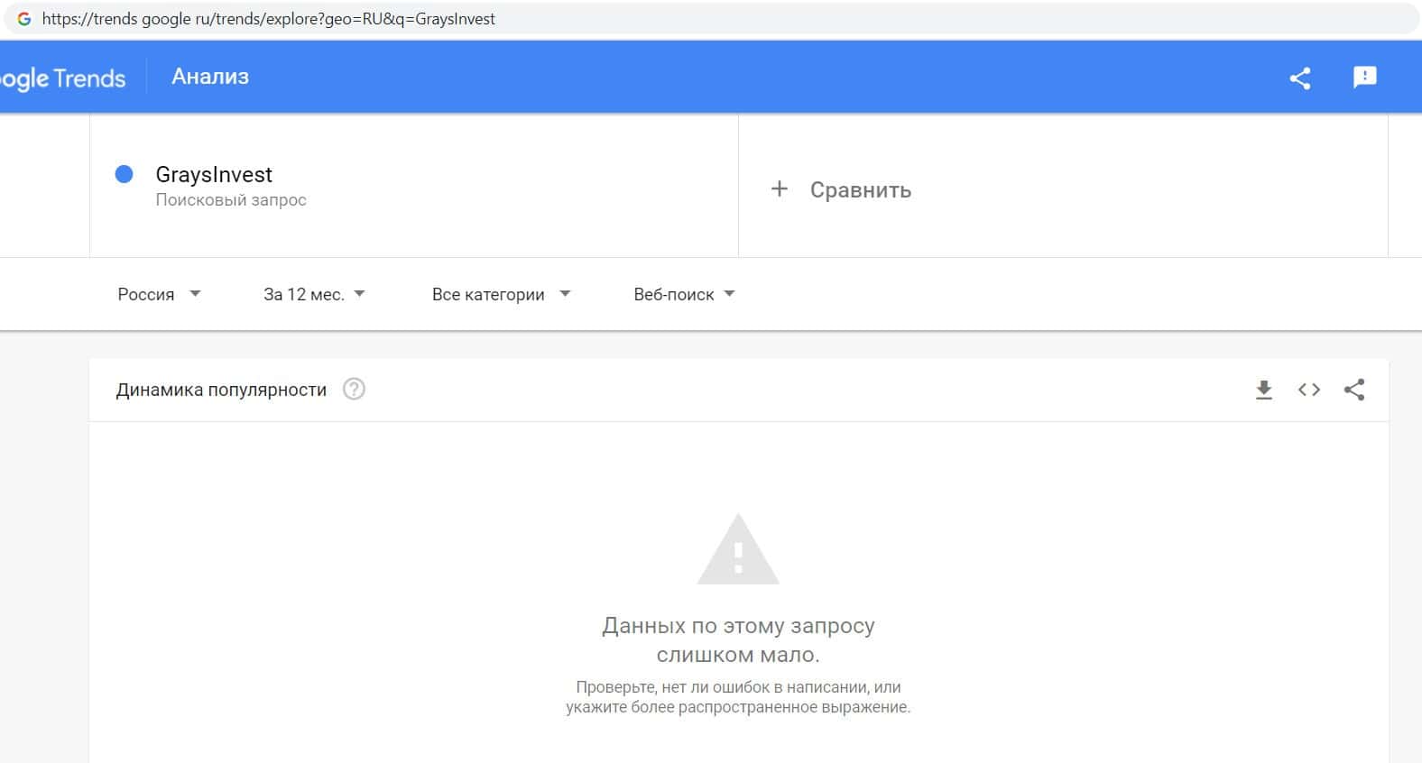 Мы решили проверить количество запросов компании аферистов GraysInvest в Google по названию фирмы, а именно "GraysInvest". Данный запрос пользователи не совершали.
