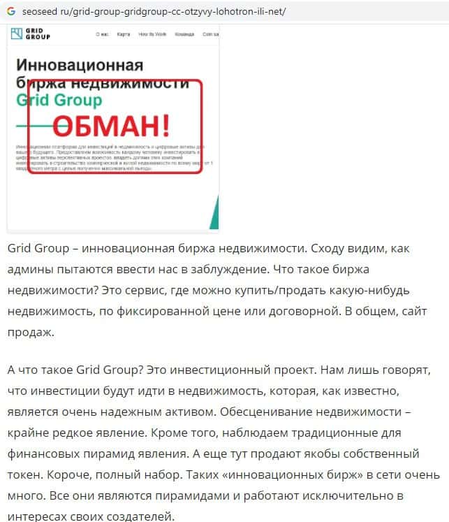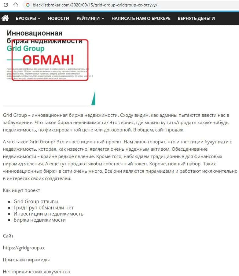 Слава о жуликах Грид Групп так быстро распространяется, что много ресурсов подмечают тот факт, как они пытаются влить в уши людям, что являются биржей недвижимости.
