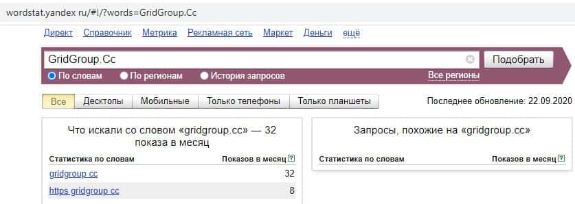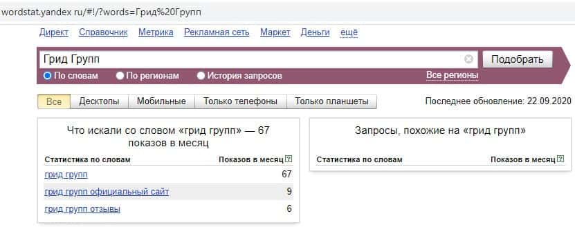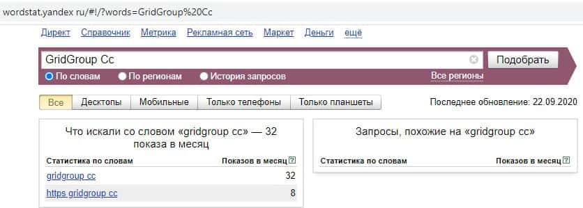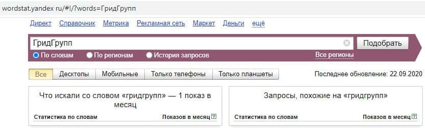 И последний запрос в Яндекс на русском языке без пробела "ГридГрупп" выдает результат всего 1 показ в месяц. Самый низкий показатель из всех.