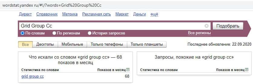 Третий запрос в яндексе на английском языке с одним пробелом и точкой "Grid Group.Cc" выдает результат, как и в прошлый раз - 68 показов в месяц.