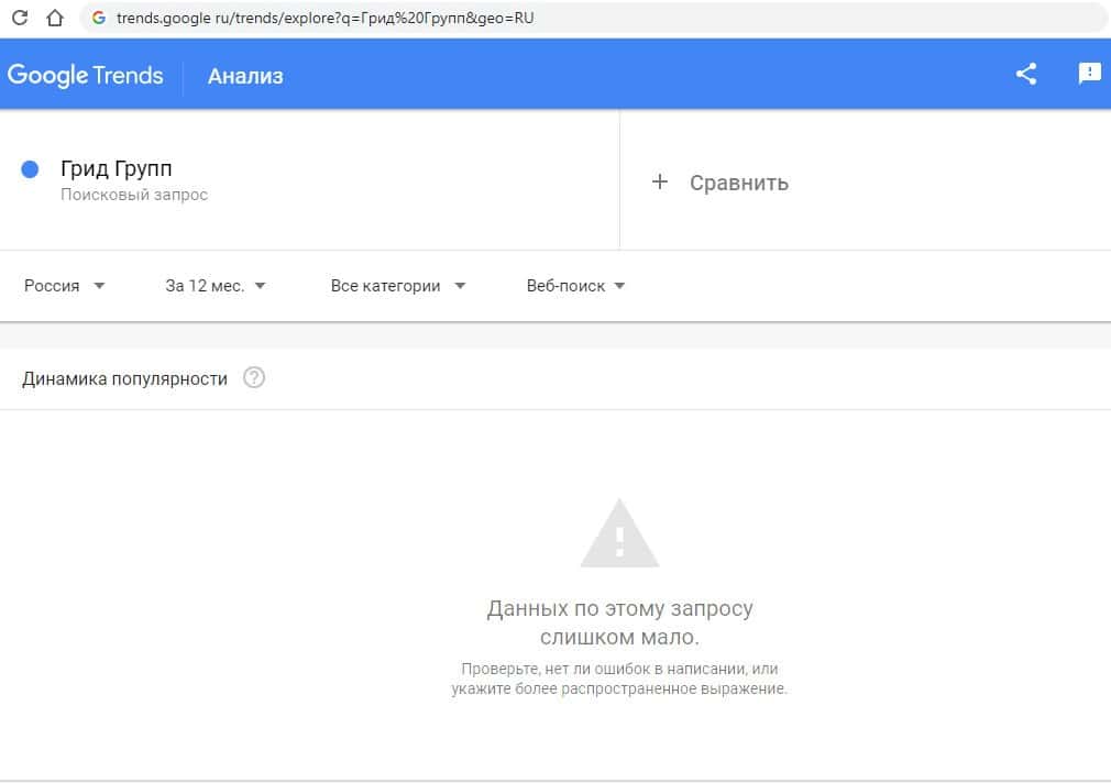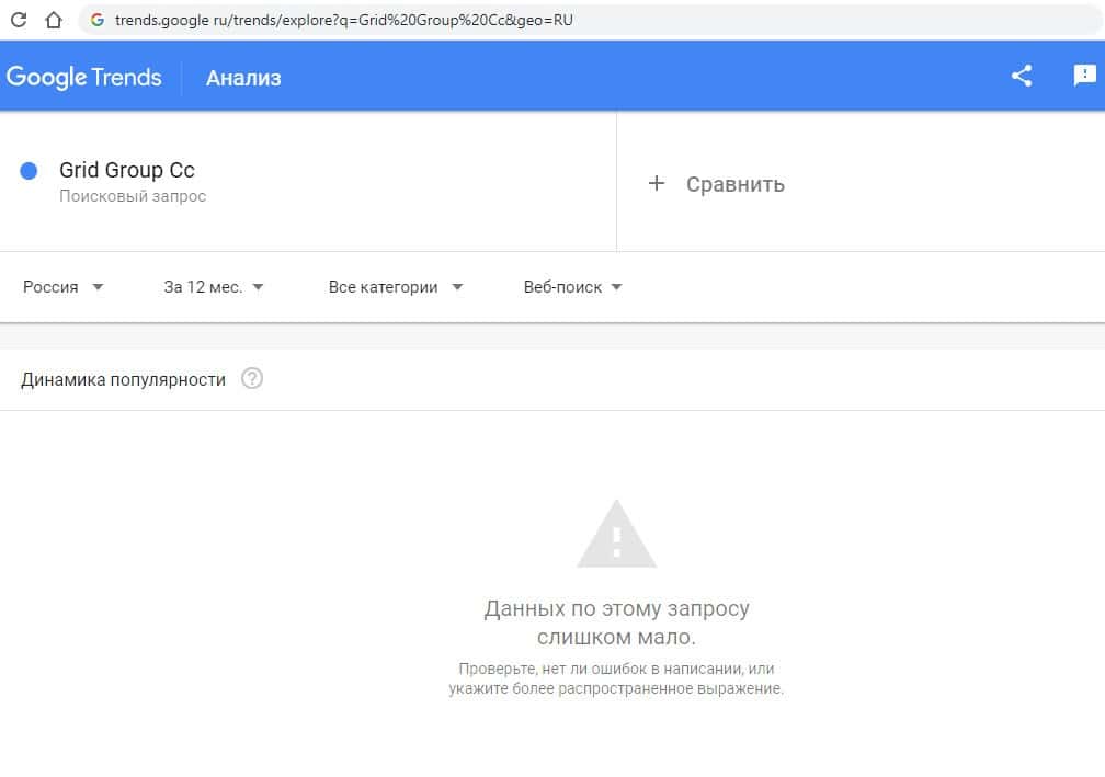 Второй запрос на английском языке в Google только с 2 пробелами "Grid Group Cc" выдает точно такой же результат, как и в предыдущем случае - 0 показов в месяц.