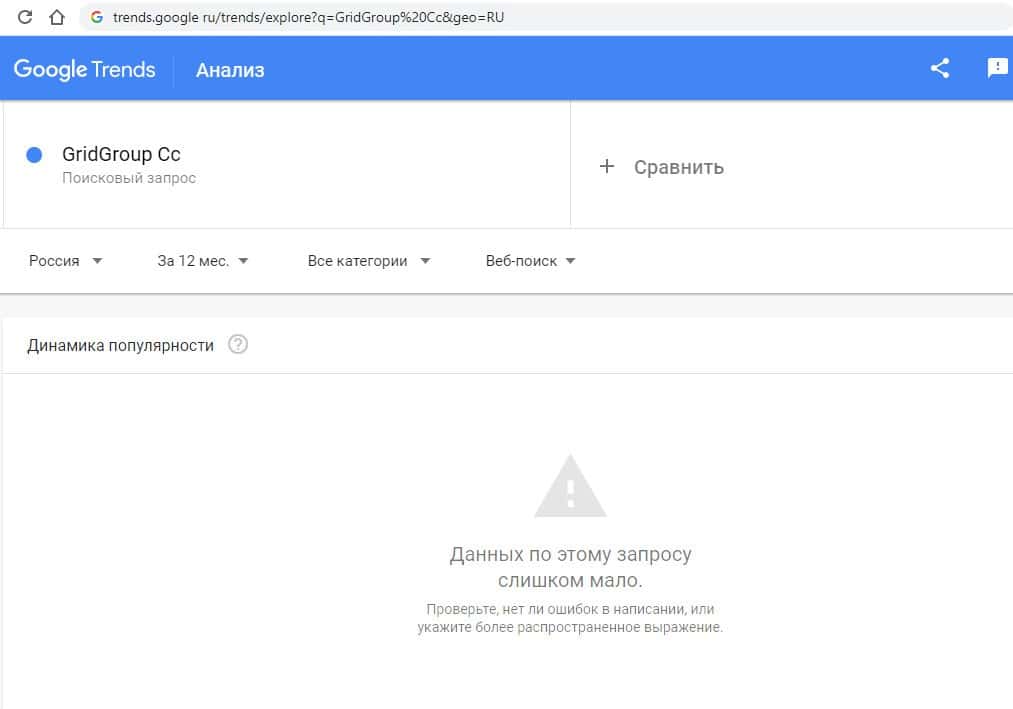 Начинаем с запросов на английском языке. Первый запрос на английском языке в Гугл "GridGroup Cc" выдает результат в 0 показов в месяц. Так информацию никто не ищет.