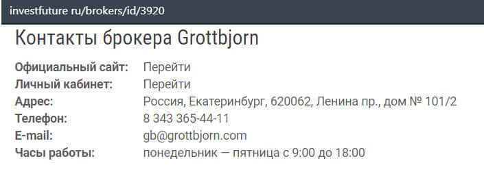 Не смотря на якобы длительную историю развития компании ГроттБйорн (на сайте брокера пишут, что работают с середины 90-х годов), не рекомендуем связываться с этой крайне сомнительной организацией, ведь отзывов о GrottBjorn в сети почти нет, а это указывает на то, что сея контора отслеживает негативную информацию о себе и тут же ее подчищает. Также прошу взглянуть на рейтинги фондовых брокеров, в которых ГроттБйорн в основном отсутствует из-за малой активности, недостаточных оборотов и т.д.