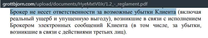 В договоре, который предлагает контора GrottBjorn, спряталось много подводных камней, которые опасны для клиентов. В одном из пунктов там сказано, что аферисты не несут ответственность за то что они не сообщат клиенту об изменениях в договоре. Так данный документ может однажды превратиться в долговую расписку.