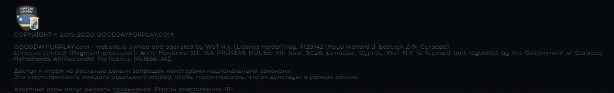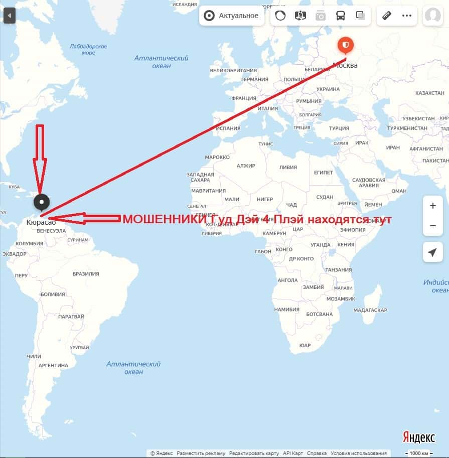 Чтобы спрятаться как можно дальше, жулики Гуд Дэй 4 Плэй решили зарегистрироваться в оффшорной зоне, а именно - в Кюрасао. Известное место обитания всех мошенников.