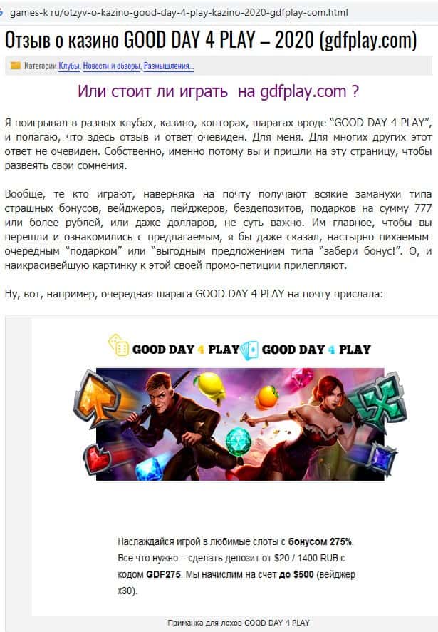Первый ресурс в интернете говорит о том, что Гуд Дэй 4 Плэй - это банальный лохотрон, с которым просто нельзя связываться. И деньги в этом казино вам выиграть не удастся.