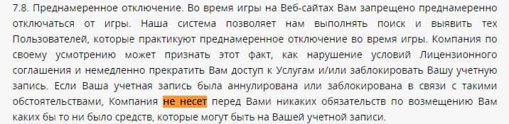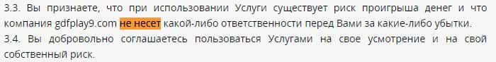 Как и все остальные жулики GDFPlay предпочитают не отвечать за ваши убытки. В том числе и те, которые они вам сами сделают.