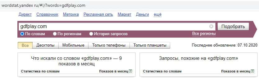 И последний запрос в яндексе на английском языке с точкой "gdfplay.com" выдает уже результат в 9 показов в месяц.