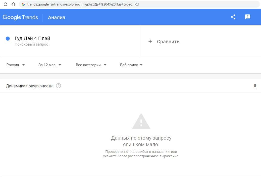 Первый запрос в Гугл на русском языке с тремя пробелами "Гуд Дэй 4 Плэй" выдает результат в 0 показов в месяц. Так информацию о жуликах никто не ищут.