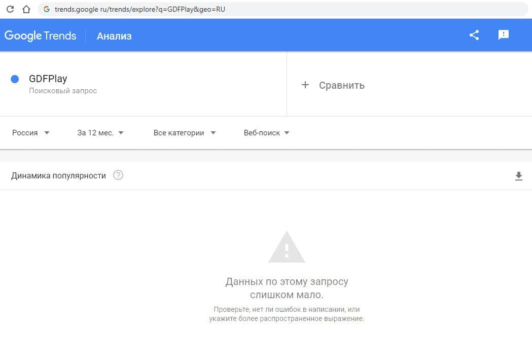 Второй запрос в Google на английском языке без пробелов "GDFPlay" выдает точно такой же результат, как и в первом случае - 0 показов в месяц.