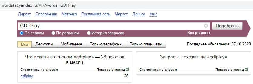 Второй запрос в яндексе на английском языке без пробелов "GDFPlay" выдает уже результат в 26 показов в месяц. Это существенно больше, чем в предыдущем случае.
