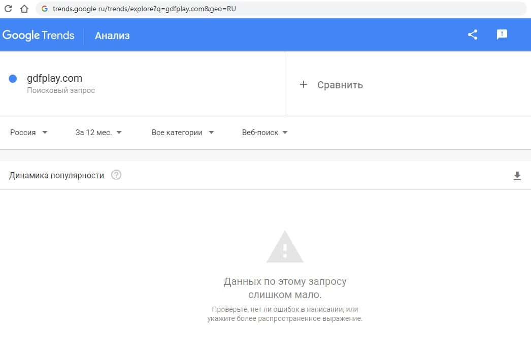 И последний запрос в гугл на английском языке с точкой "gdfplay.com" выдает результат в 0 показов в месяц, как и во всех предыдущих случаях.