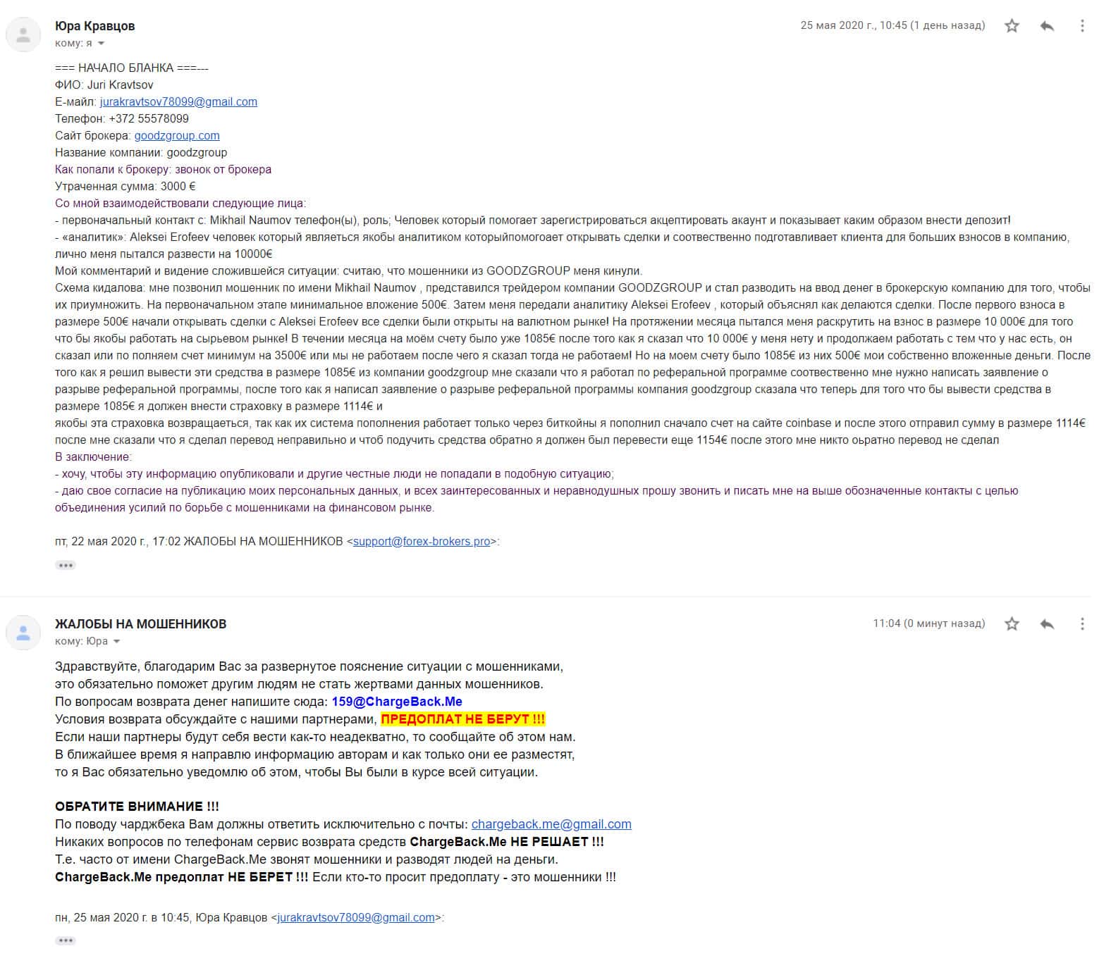 Далее предлагаем ознакомится с подробной жалобой на мошенническую организацию Гудз Групп, которая опрокинула автора данного информационного материала на 3 тысячи евро, человек упоминает участников данного развода, среди которых были следующие лица: Mikhail Naumov и Aleksei Erofeev.