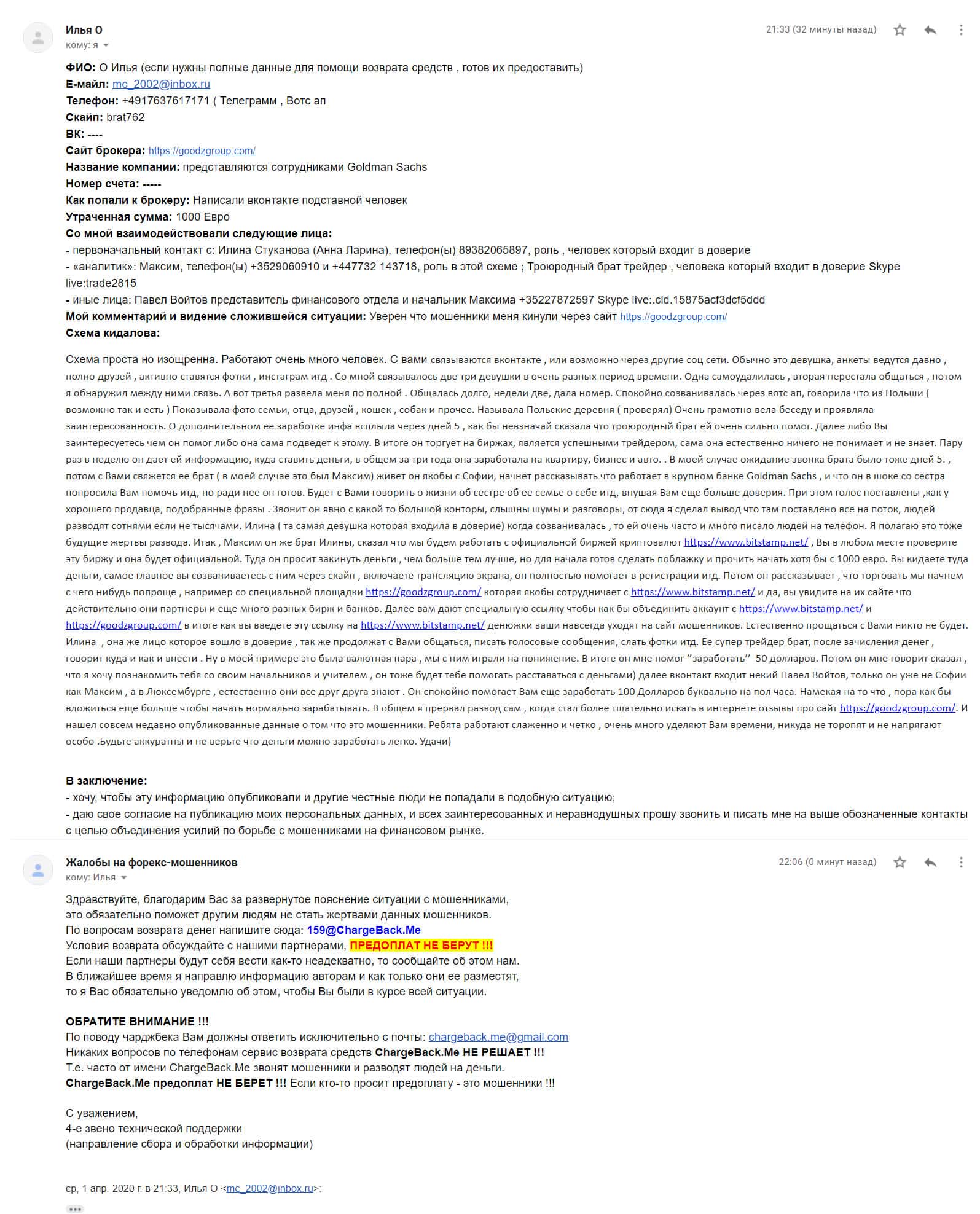 Далее представлена первоначальная жалоба, в которой рассказывается, что лохотрон Гудз Групп украл деньги у наивного клиента.