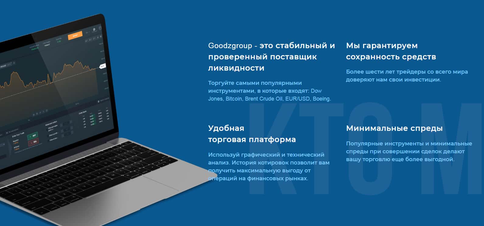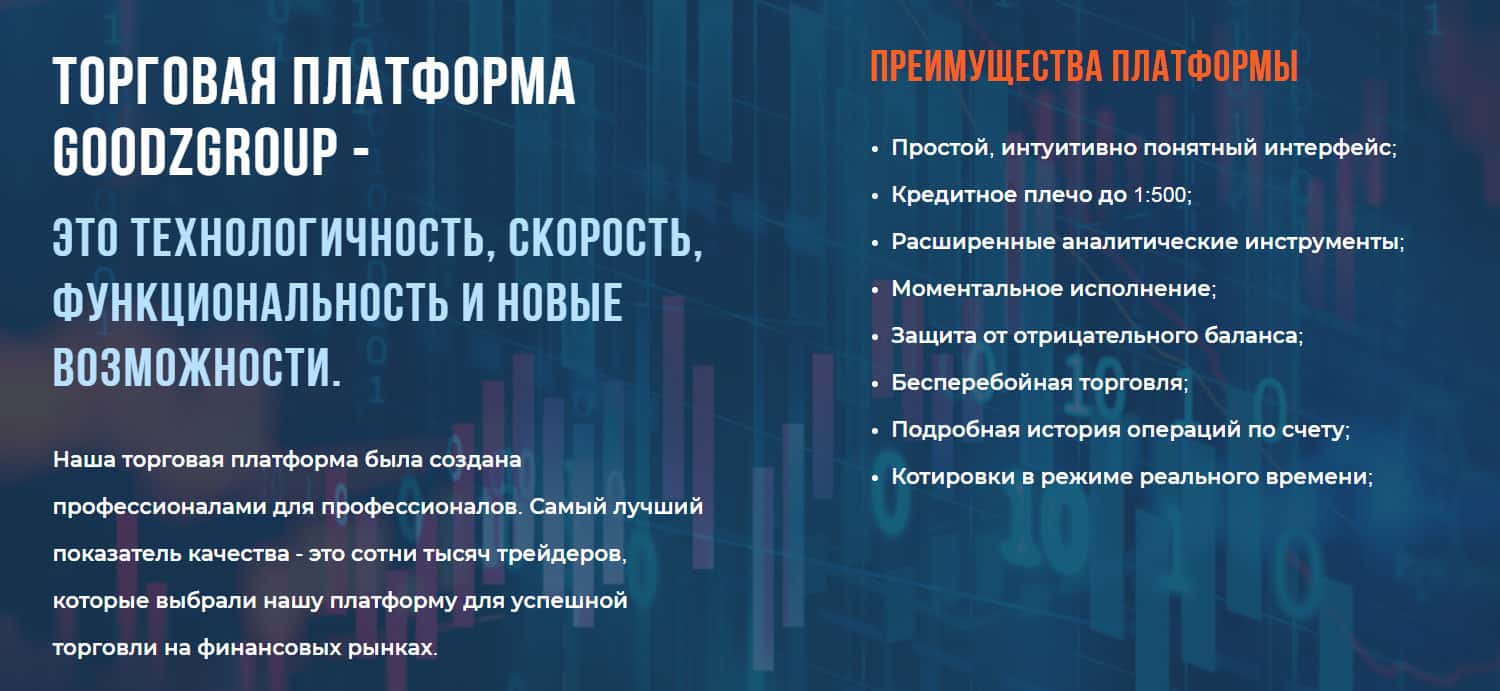 В последующем разделе уже более детально описываются те пункты, ради которых пользователю стоит вложить свои финансовые средства в эту пропащую контору Гудз Групп и забыть о них навсегда. А как иначе, у них же моментальное исполнение, бесперебойная торговля и еще куча плюсов для наивных людей.