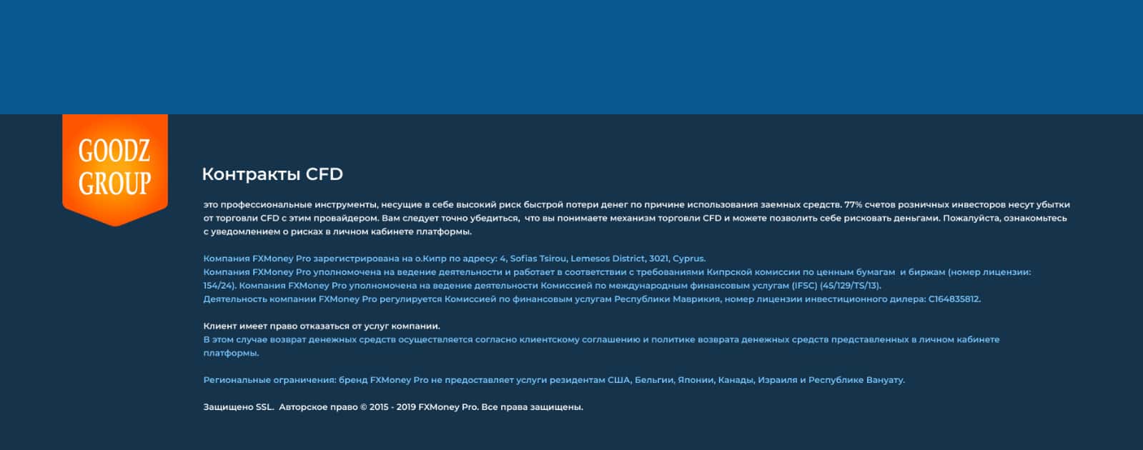 В разделе, который описан внизу страницы мошенники GoodzGroup очень мелким шрифтом пишут о том, что их инвестор зарегистрирован на о. Кипр по адресу: 4, Sofias Tsirou, lemesos Destrict, 3021, Cyprus.
