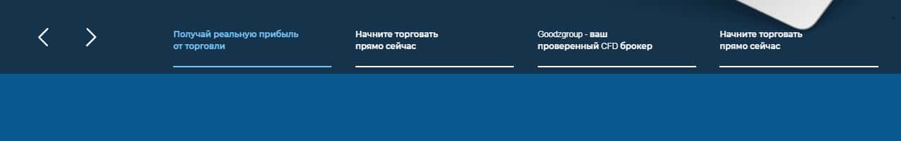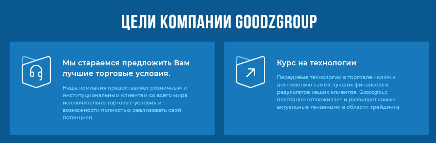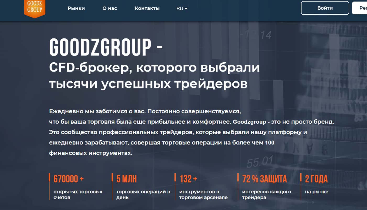 В разделе о компании администрация GoodzGroup напоминает о своем шикарном доверительном управлении и постоянном совершенствовании, чтобы торговля их пользователей была еще прибыльнее и комфортнее. А еще много красивых цифр ярким цветом, для привлечения клиентуры.