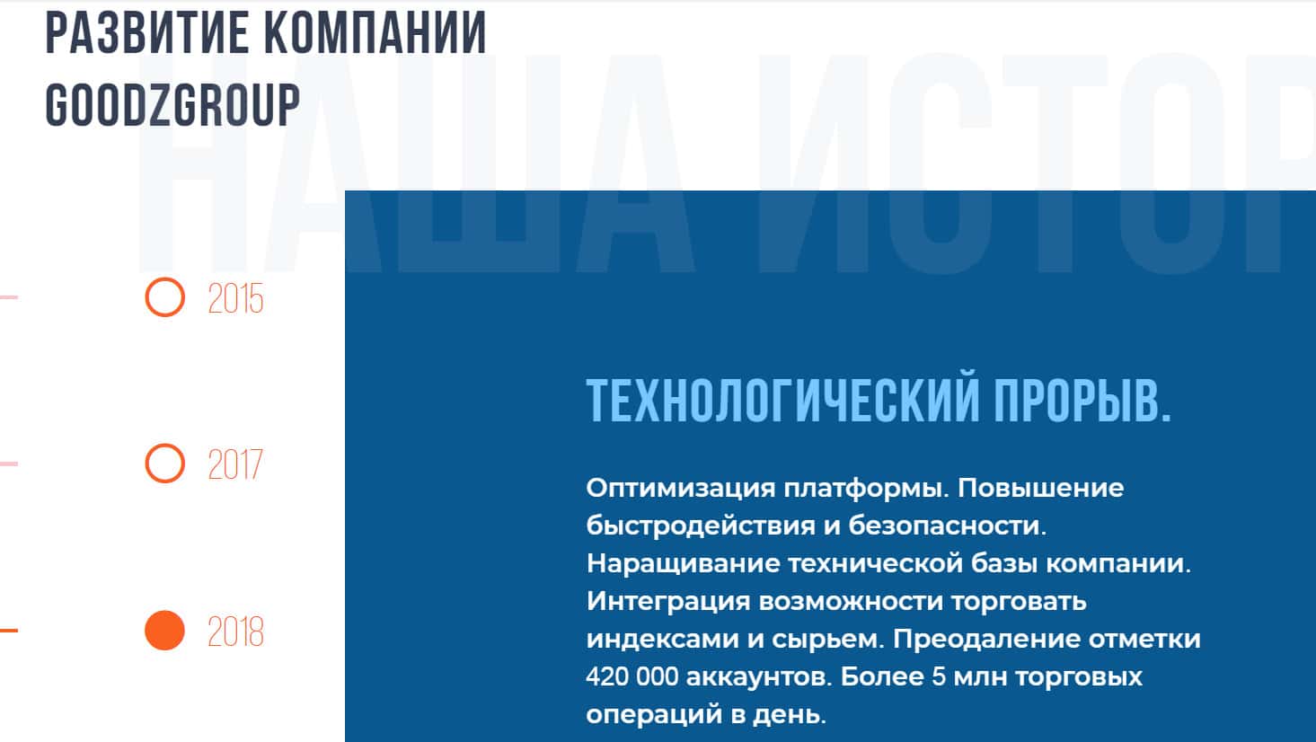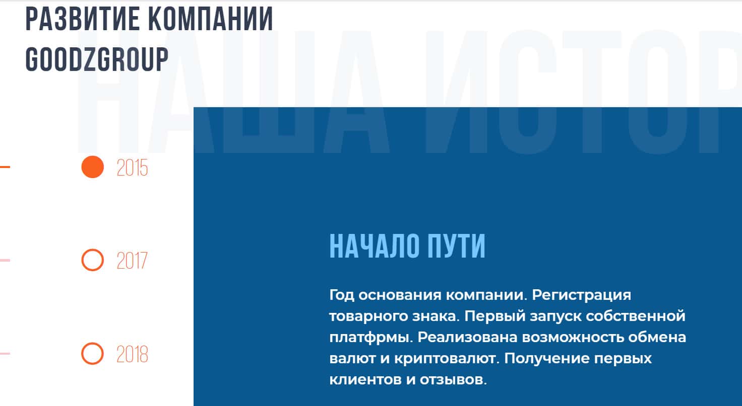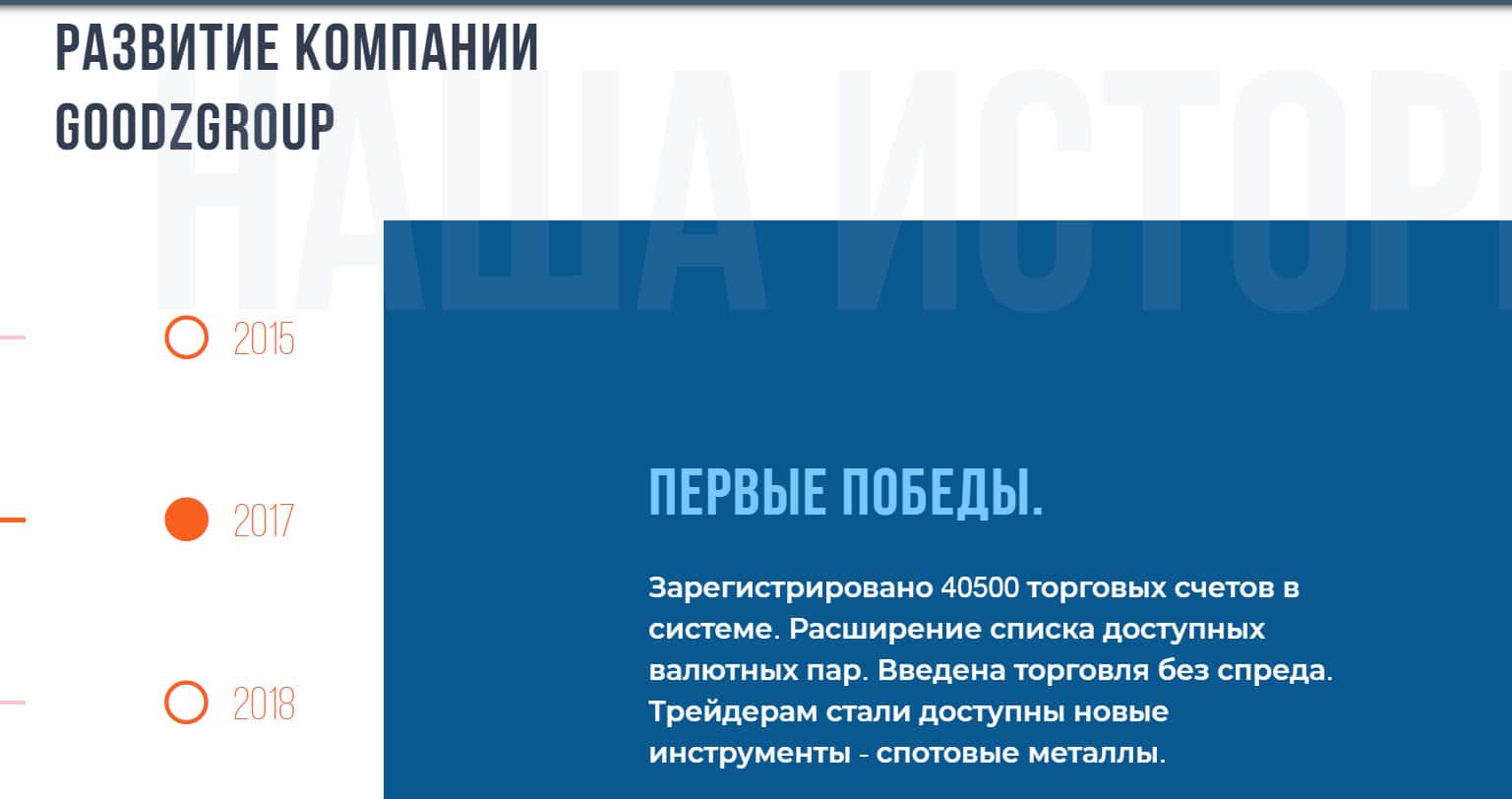 На своем официальном сайте мошенники GoodzGroup придумали сделать раздел о развитии компании, как презентабельно и круто работать в их конторе. О колоссальном заработке, благодаря сотрудничеству и честных, выгодных торгах. Что только аферисты не делают, чтобы заманить побольше наивных людишек в свою берлогу