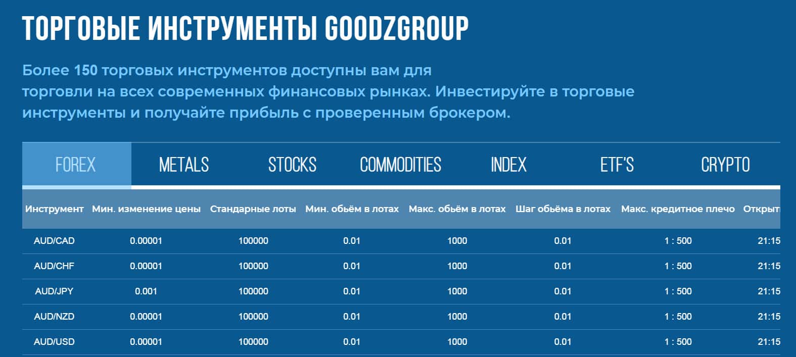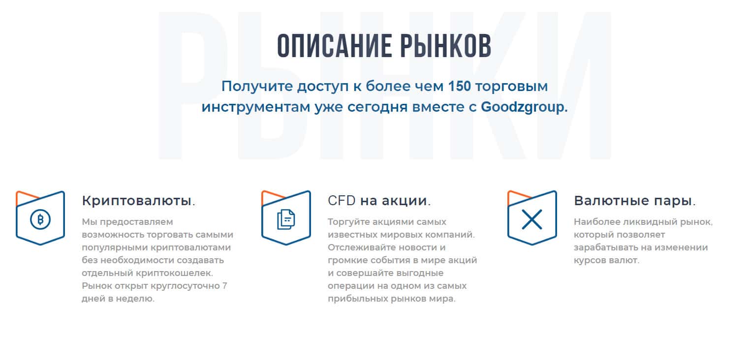 В разделе торговых инструментов администрация напоминает о своих шикарных возможностях инвестировать в торговые инструменты и легко получать прибыль с проверенным брокером. Главное заставить верить доверчивых клиентов в то, что внедрение их в деятельность подвальной кухни GoodzGroup позволяет вести крупные и честные торги.