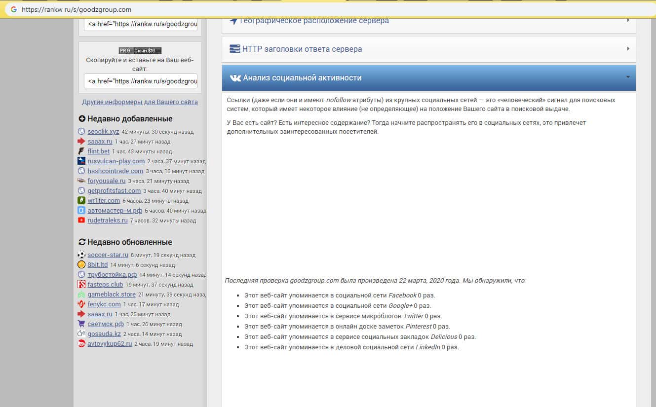 В подтверждение информации об отсутствии шараги Гудз Групп в сетях социальной активности, мы провели тест на сайте rankw ru, который анализирует сайт по его домену. Что мы получили в итоге можно увидеть на изображении, расположенном ниже - никакой активности аферисты GoodzGroup не проявляют.