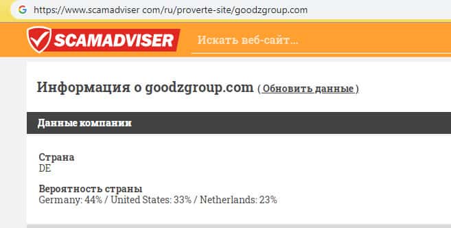 Как известно, лохотрон GoodzGroup занимается нечестным бизнесом, а потому его реальные руководители предпочитают анонимность дабы избежать ответственности со стороны правоохранительных органов. Техническая же информация найдена на портале scamadviser com, что можно увидеть на изображении, расположенном ниже.