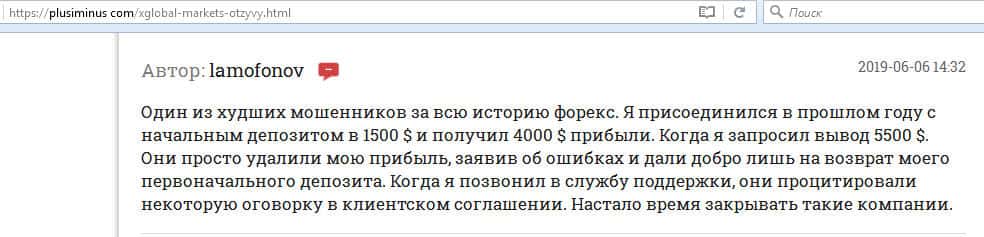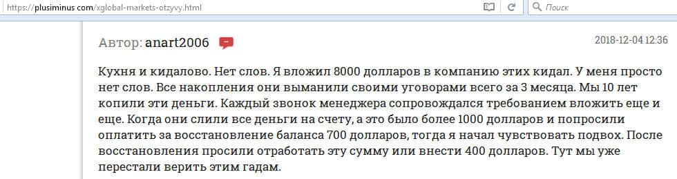- Клиент XGLOBAL написал отзыв на сайте плюсминус ком о разводе его на 8 000 долларов