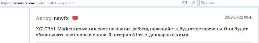 В интернете на сайте plusiminus com был найден отзыв человека под псевдонимом newfx, в котором автор предупреждает, что в компании Х Глобал воруют деньги снова и снова, его потери составили порядка 81 000 долларов. НЕ ВЕРЬТЕ сказкам о чудесных условиях в XGLOBAL !!!