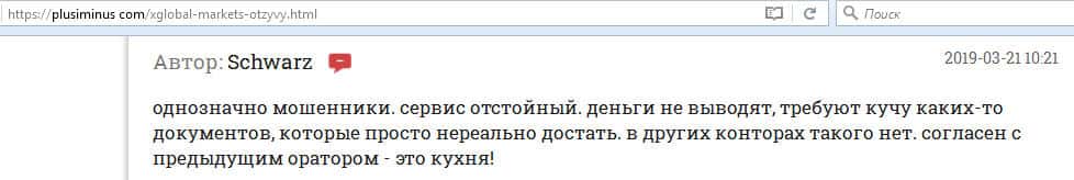 Очередной негативный отзыв о сложностях с выводом денег из компании ХGLOBAL пишет некий Schwarz на веб-сайте plusiminus com. Для того, чтобы забрать обратно свои же деньги мошенники от него требуют кучу документов, о которых не указано на сайте. Для нас брокер XGLOBAL является ЖУЛИКОМ !!!