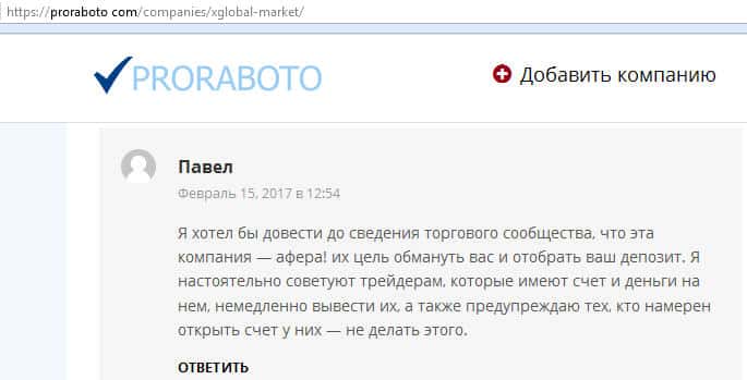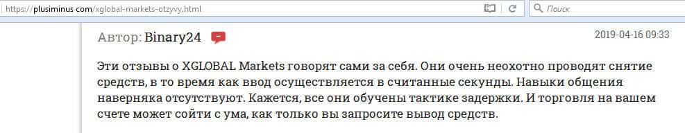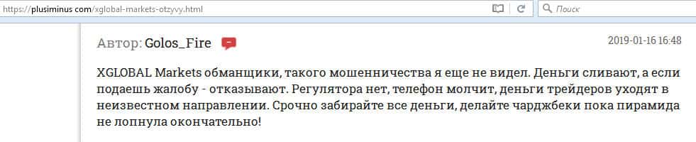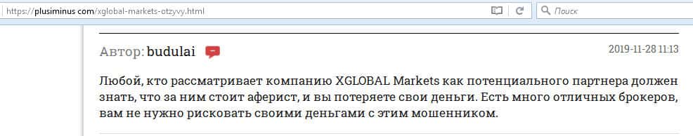 На информационном ресурсе плюсиминус ком некий budulai оставил отзыв, в котором говориться, что не стоит рассматривать контору xglobal как потенциального партнера и рисковать деньгами, так как они АФЕРИСТЫ !!!