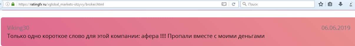 В глобальной сети-интернет на информационном сайте ratingfx ru найден отзыв об очередном факте воровства денег клиентов брокером ХGLOBAL. Автор комментария под ником Viking30 просит не связываться с аферистами.