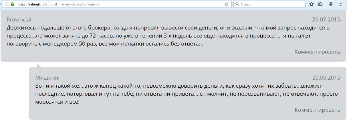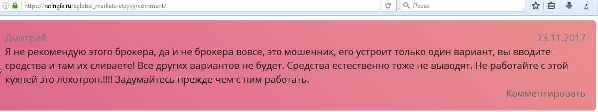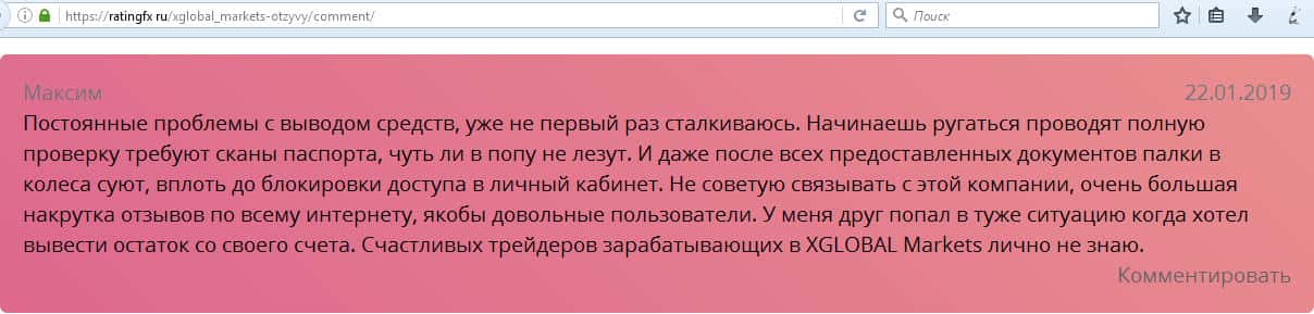 Отзыв Максима, бывшего клиента брокера XGLOBAL, оставленного на ресурсе ratingfx ru