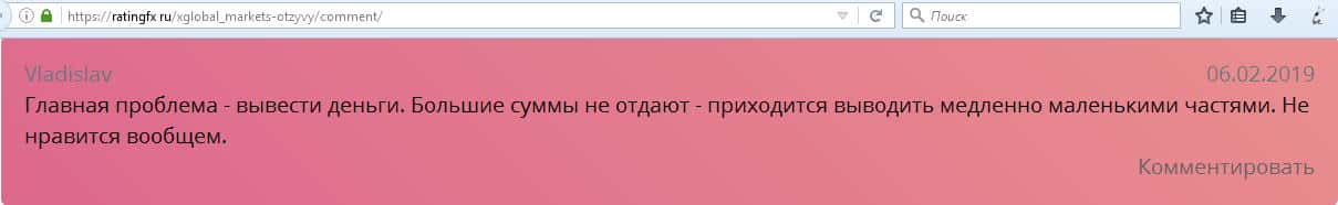 На сайте ratingfx ru был найден отзыв некого Владислава о мошенниках XGLOBAL. Очередной их клиент не смог нормально забрать обратно свои деньги. Приходится выводить маленькими частями, чтобы аферисты на блокировали вывод. Обходите этот ЛОХОТРОН стороной !!!