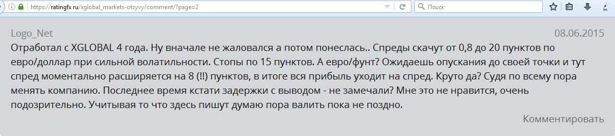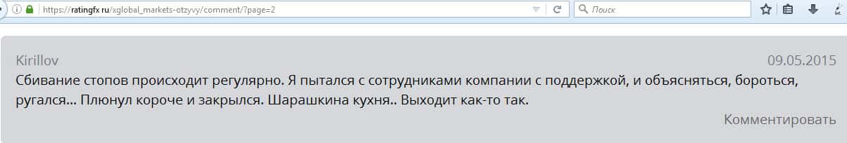 Еще один отзыв о сбивании стопов брокером XGLOBAL найден в сети инет на портале ratingfx ru, автором которого является некий Виталий. Сделки зависают в нужный момент, а в это время цена сбивает стоп и закрывает ордер по наихудшей для трейдера цене. Найти виноватых невозможно. Бегите из ХГЛОБАЛ пока не поздно !!!