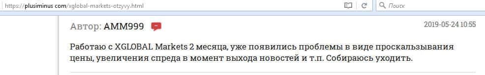 Трейдер с ником АММ999 на сайте plusiminus com пишет, что у брокера в последнее время появились проскальзывания и расширение спреда. Классика жанра кухни - это дать клиентам заработать первое время, а когда они потеряют бдительность слить их депозит подчистую. XGLOBAL - МОШЕННИКИ!!!