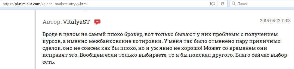 - Межбанковские котировки XGLOBAL рисует самостоятельно, отзыв VitalyaST c сайта plusiminus com